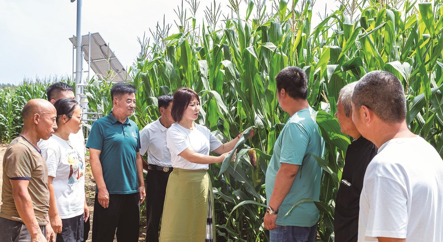 梨樹縣鳳凰山農(nóng)機(jī)農(nóng)民專業(yè)合作社理事長(zhǎng)韓鳳香正在和村民們查看玉米授粉和長(zhǎng)勢(shì)情況。高鴻 攝