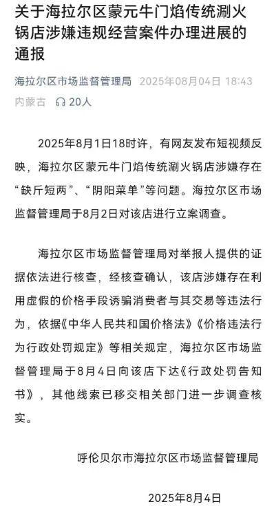 8月2日,海拉爾區(qū)市場監(jiān)管局也展開立案調(diào)查。最新通報顯示,8月4日,內(nèi)蒙古呼倫貝爾市海拉爾區(qū)市場監(jiān)督管理局針對涉事火鍋店涉嫌違規(guī)經(jīng)營一案向該店下達(dá)了《行政處罰告知書》。