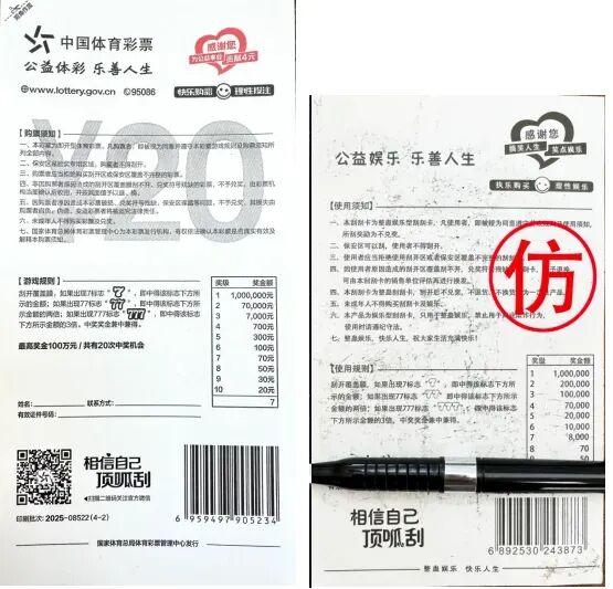 多地發(fā)生兌獎鬧劇,上演了人生倍速版“大起大落”。這些“整蠱彩票”都以即開型體育彩票為主。正規(guī)合法的即開型體育彩票到底長啥樣?根據(jù)國家體育總局體育彩票管理中心發(fā)布的聲明,即開型體育彩票使用環(huán)保紙張和油墨,綠色、健康、易刮開; 保安區(qū)和刮開區(qū)均有覆膜,票面印有防偽裝飾紋,圖案完整;票面印有體彩+頂呱刮標(biāo)識及面值金額,刮開后的游戲區(qū)域有防偽底紋,且游戲符號、獎金標(biāo)志清晰易辨別。票背 印有發(fā)行機(jī)構(gòu)、公益金貢獻(xiàn)金額和官方網(wǎng)址等信息。