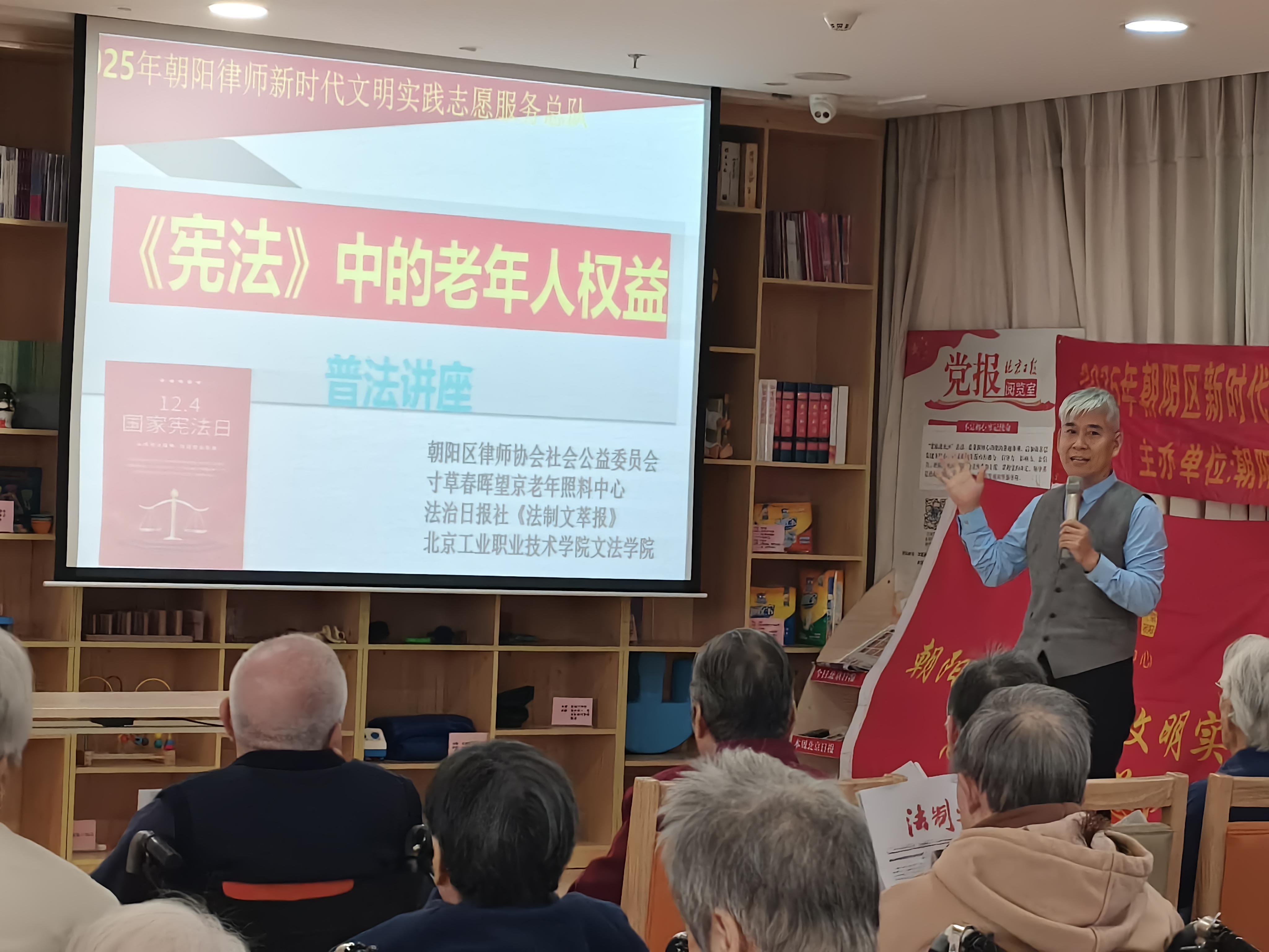 12月4日,在第十二個國家憲法日當(dāng)天,法治日報社《法制文萃報》攜手北京市朝陽區(qū)律師協(xié)會公益與社會責(zé)任委員會律師團、北京工業(yè)職業(yè)技術(shù)學(xué)院文法與管理學(xué)院師生,走進寸草春暉望京老年公寓,以“弘揚憲法精神,維護老年人權(quán)益”為主題開展公益普法活動,旨在讓法治服務(wù)觸手可及,讓憲法精神浸潤老年生活。