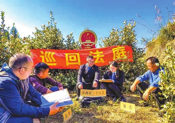 圖為重慶市酉陽土家族苗族自治縣人民法院酉酬人民法庭庭長(zhǎng)陳長(zhǎng)周在油茶林里現(xiàn)場(chǎng)開庭審理合同糾紛。資料圖片