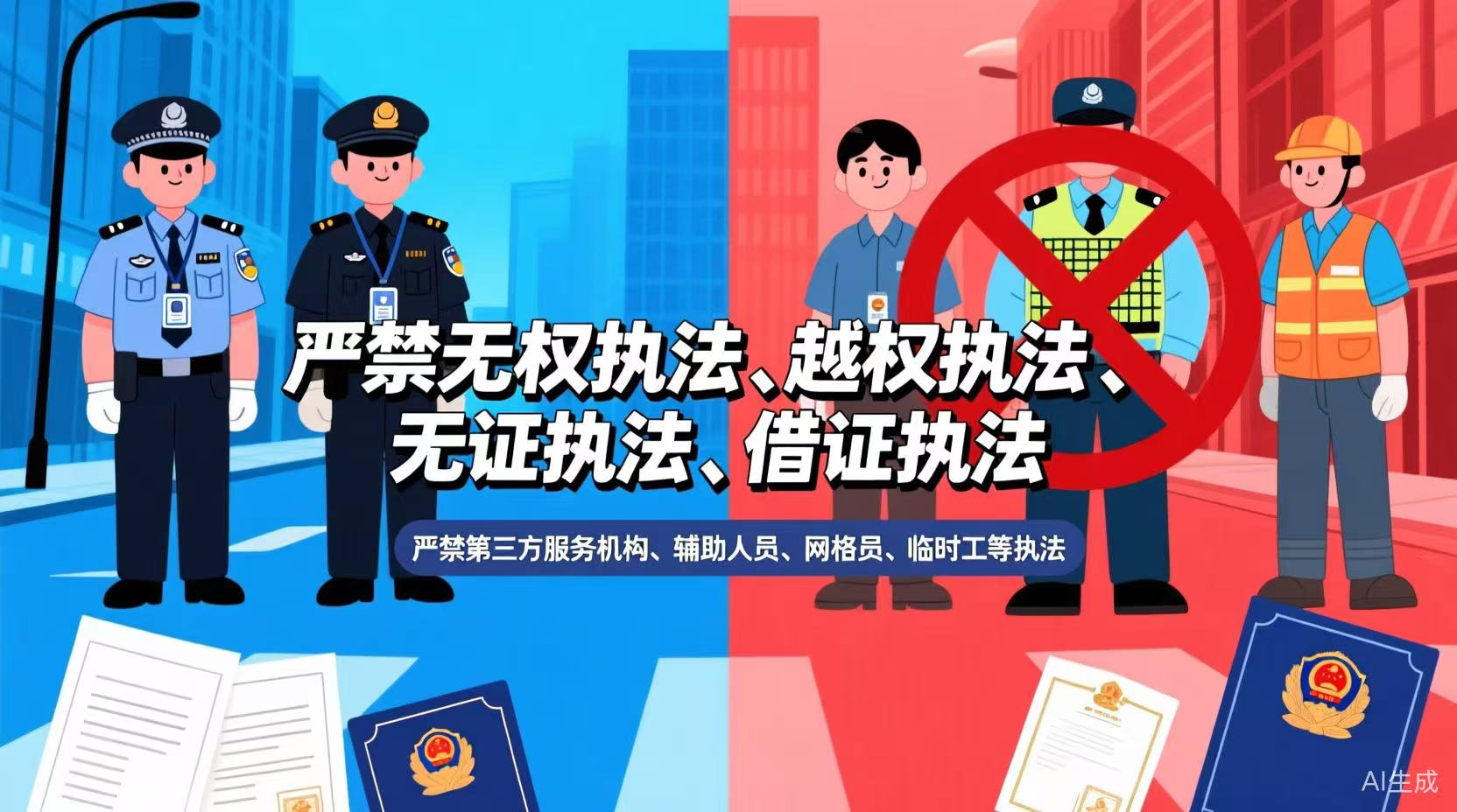 嚴禁無權(quán)執(zhí)法、越權(quán)執(zhí)法、無證執(zhí)法、借證執(zhí)法。嚴禁第三方服務(wù)機構(gòu)、輔助人員、網(wǎng)格員、臨時工等執(zhí)法。