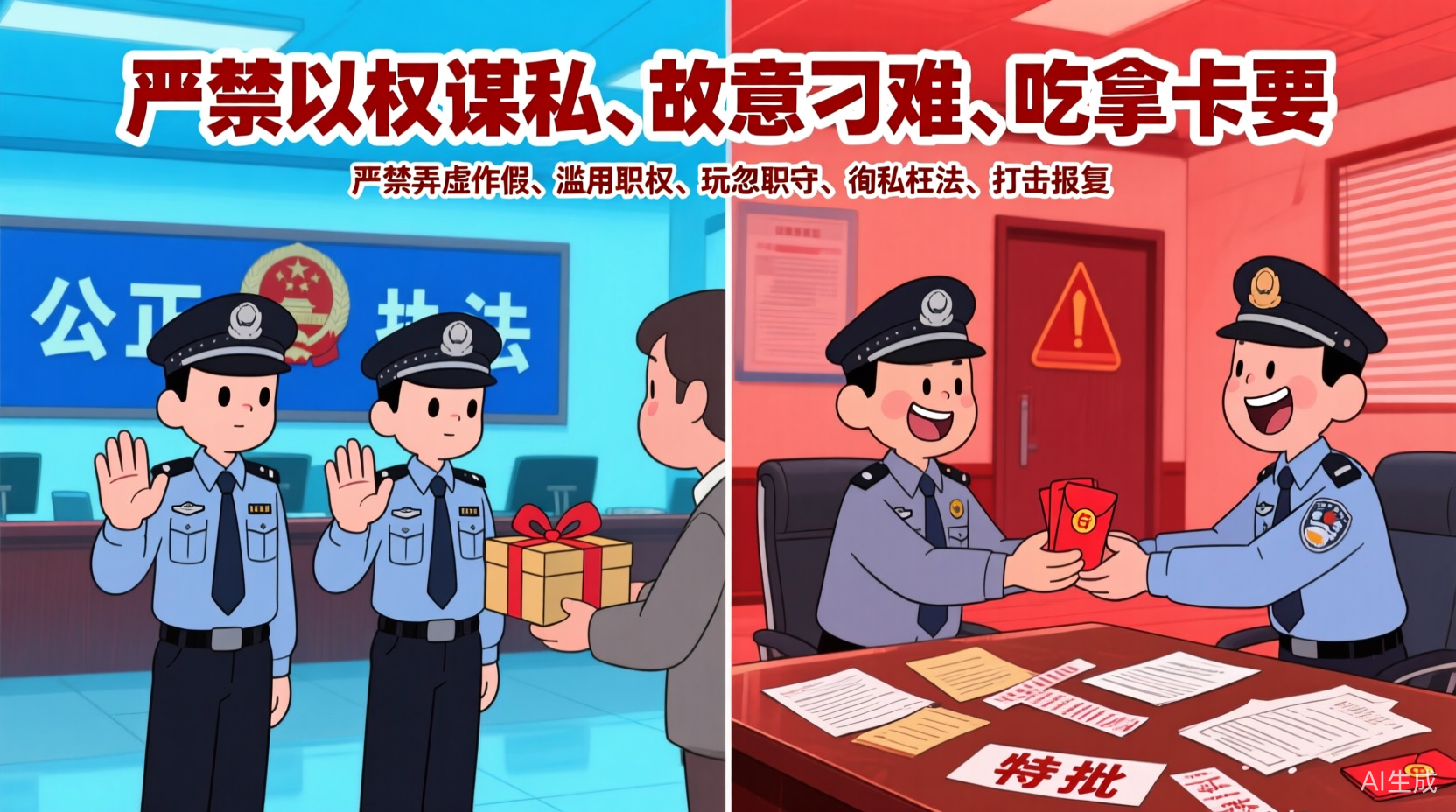 嚴禁以權(quán)謀私、故意刁難、吃拿卡要、弄虛作假、濫用職權(quán)、玩忽職守、徇私枉法、打擊報復(fù)。嚴禁從事有礙公正執(zhí)法的活動。嚴禁違規(guī)從事營利性活動。嚴禁違規(guī)向管理服務(wù)對象收取或攤派財物、要求其提供服務(wù)。嚴禁干預(yù)執(zhí)法活動、插手具體案件、過問案情。