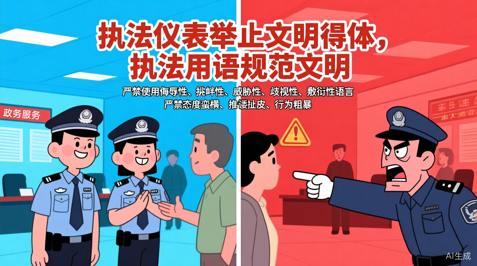 執(zhí)法儀表舉止文明得體,執(zhí)法用語規(guī)范文明,尊重當事人和利害關(guān)系人。嚴禁使用侮辱性、挑釁性、威脅性、歧視性、敷衍性語言。嚴禁態(tài)度蠻橫、推諉扯皮、行為粗暴。
