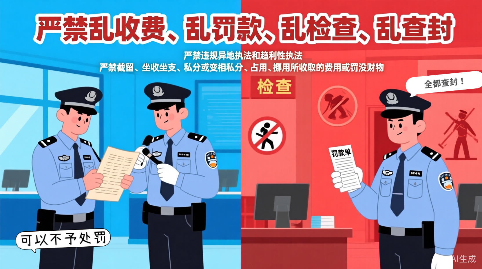 嚴禁亂收費、亂罰款、亂檢查、亂查封。嚴禁違規(guī)異地執(zhí)法和趨利性執(zhí)法。嚴禁下達或變相下達罰沒指標。嚴禁截留、坐收坐支、私分或變相私分、占用、挪用所收取的費用或罰沒財物。