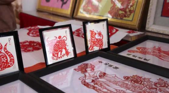 圖為甘肅省平?jīng)鍪徐`臺縣什字鎮(zhèn)文化廣場文化活動室里的剪紙作品