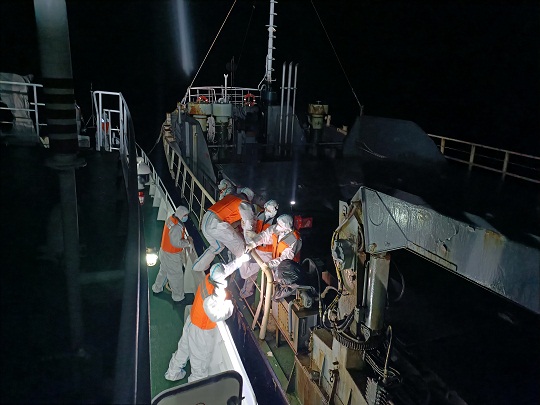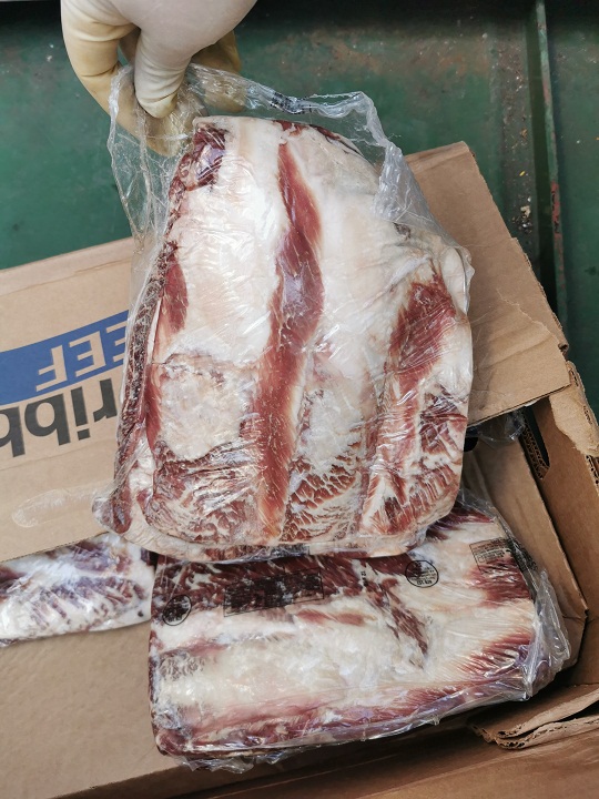 3月30日,涉案走私團伙準(zhǔn)備在山東威海海域?qū)嵤┳咚椒缸锘顒?。得知線索后,山東海警局立即派遣威海海警局執(zhí)法艦艇前往目標(biāo)海域開展查緝。在執(zhí)法艦艇發(fā)現(xiàn)嫌疑船舶并靠近過程中,該走私船舶突然加速意欲逃離,海警執(zhí)法員果斷將其逼停,并組織船舶登檢。經(jīng)查,該船于3月23日自韓國裝載無合法來源和未經(jīng)檢驗檢疫的日本進(jìn)口和牛肉后,關(guān)閉AIS設(shè)備進(jìn)入威海海域,被山東海警局當(dāng)場查獲。