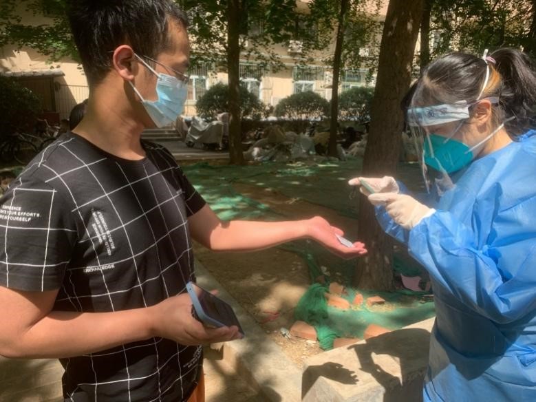 5月3日早6點,我和院里一行18名志愿者已在百萬莊社區(qū)集結(jié)就位了。登記身份信息、引導排隊秩序、解答群眾疑問……對于這些流程,志愿者們都已經(jīng)非常熟練,我和小伙伴們默契地迅速就位,投入了工作。今天,為了提高檢測效率,我領(lǐng)到了“高級任務(wù)”:協(xié)助醫(yī)生開展采樣。