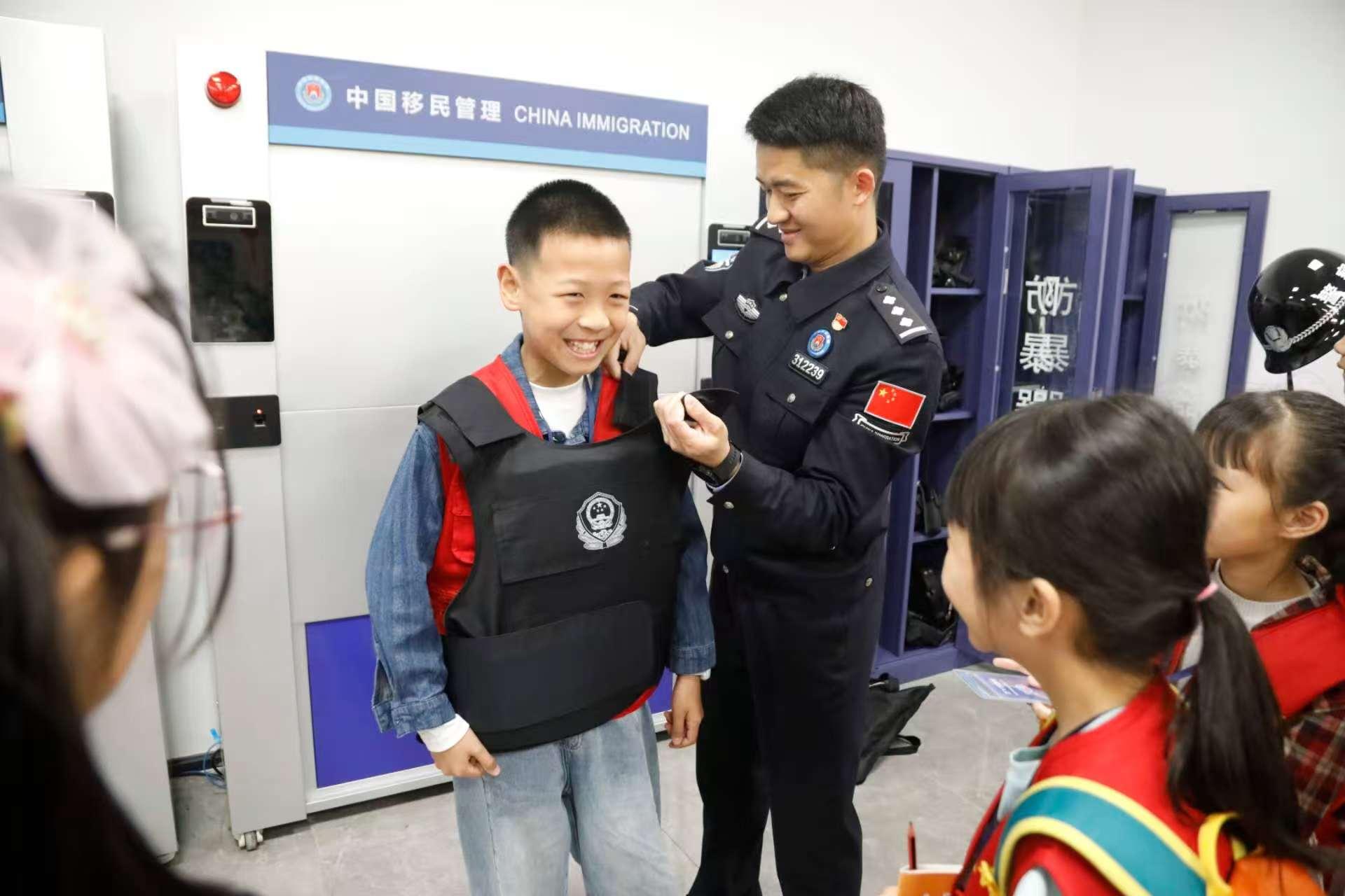 小學(xué)生們在移民管理警察的帶領(lǐng)下,先后參觀了新口岸出境大廳、碼頭泊位及入境大廳,現(xiàn)場體驗穿戴警用裝備。