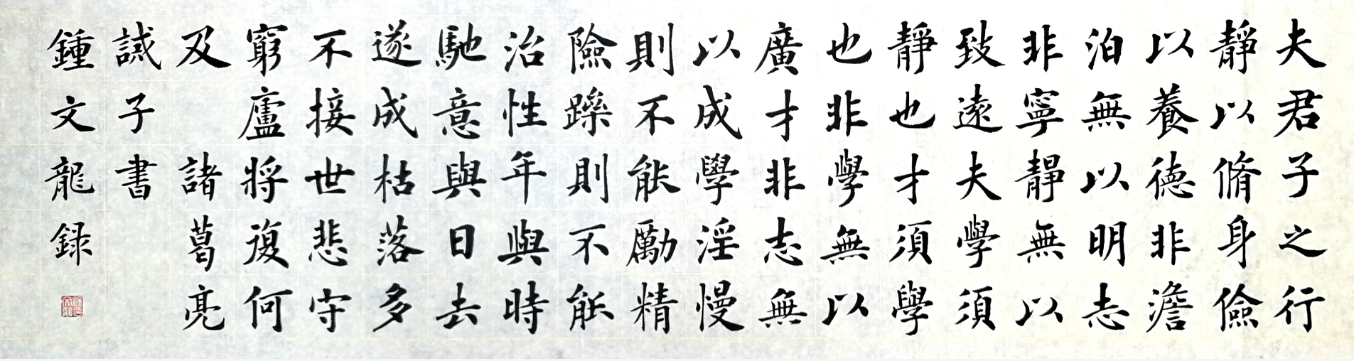 如何將家庭教育與書(shū)法有機(jī)結(jié)合?鐘文龍?zhí)剿鞒隽艘粭l用楷書(shū)書(shū)寫(xiě)歷朝傳世家訓(xùn)名篇的道路,他在不斷書(shū)寫(xiě)《顏氏家訓(xùn)》《家范》《誡子書(shū)》《朱子家訓(xùn)》等歷朝傳世家訓(xùn)名篇的過(guò)程中,逐漸感悟到通過(guò)楷書(shū)來(lái)書(shū)寫(xiě)家訓(xùn),并在家中進(jìn)行懸掛,可以起到潤(rùn)物無(wú)聲潛移默化的激勵(lì)匡正等教育作用。