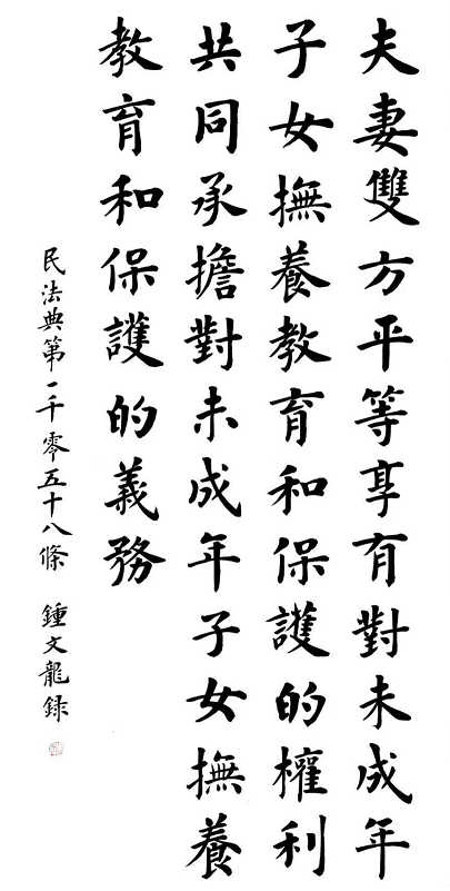 2020年7月11日,司法部普法與依法治理局和法制日?qǐng)?bào)社共同主辦了“書(shū)·法”系列活動(dòng)。鐘文龍先生應(yīng)邀書(shū)寫(xiě)民法典第一千零五十八條: “夫妻雙方平等享有對(duì)未成年子女撫養(yǎng)、教育和保護(hù)的權(quán)利,共同承擔(dān)對(duì)未成年子女撫養(yǎng)、教育和保護(hù)的義務(wù)?!币蚱渥髌分苷胖露H受好評(píng)。