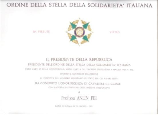 (意大利總統(tǒng)向費安玲頒發(fā)的“意大利共和國騎士勛章”及證書。說明:證書中的“ANLIN FEI”應(yīng)為“ANLING FEI”。)