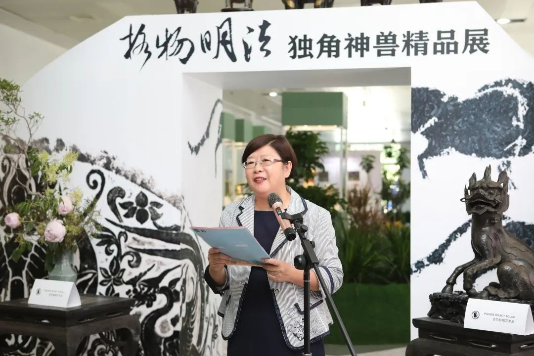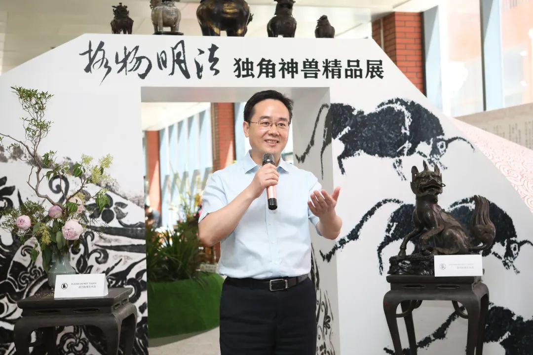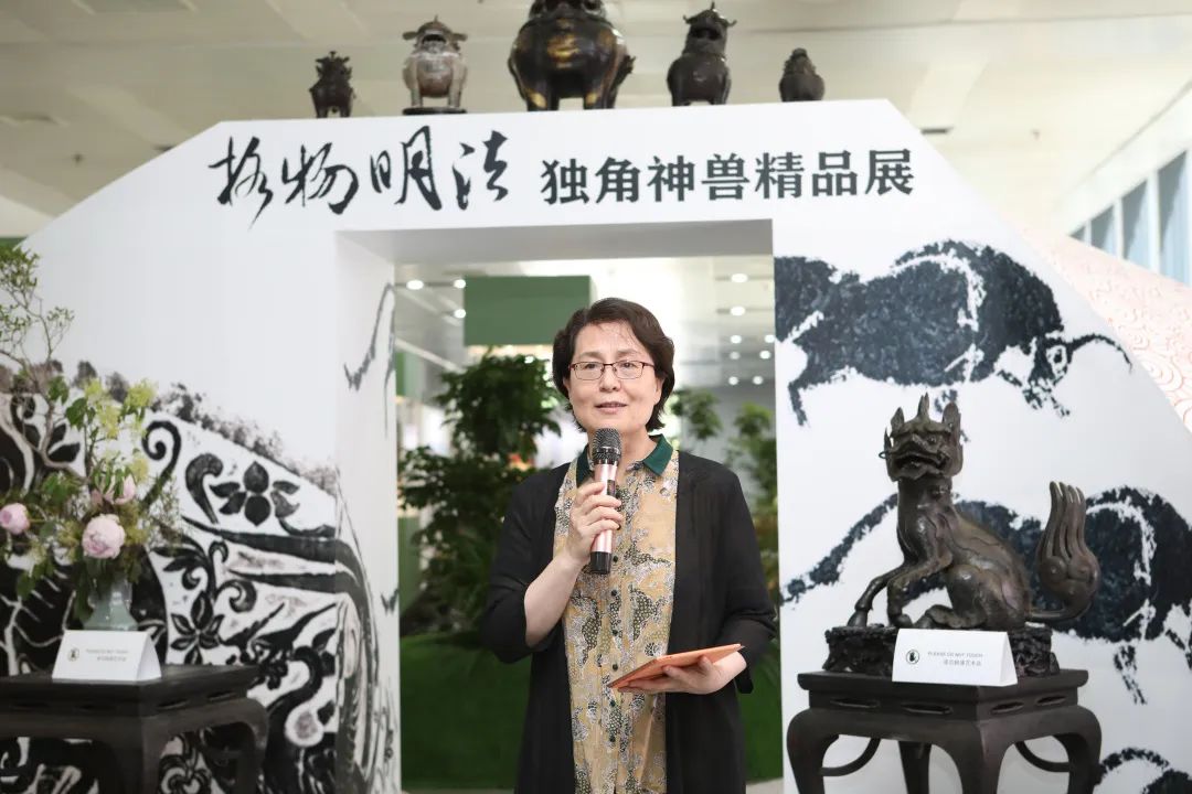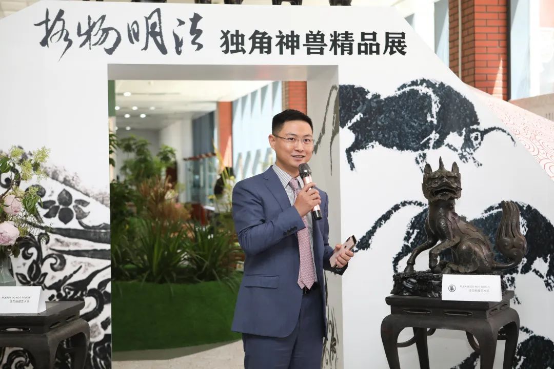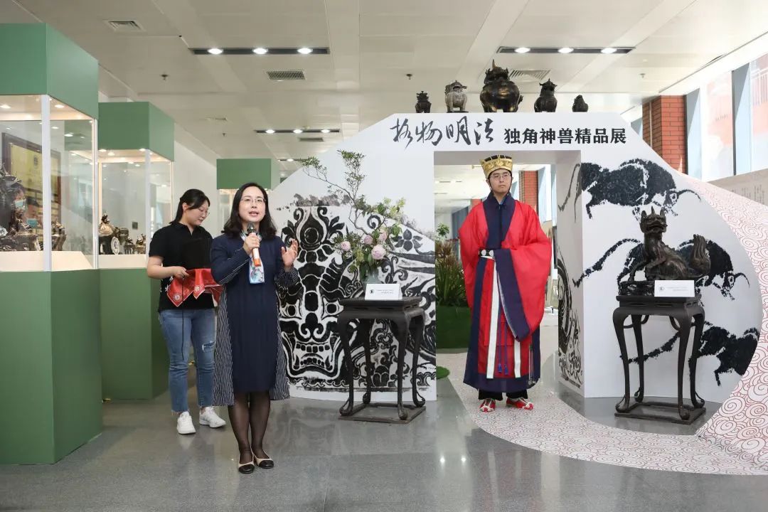 本次展覽的策展人、學(xué)術(shù)主持李雪梅教授向大家介紹了策展理念。中國有著源遠(yuǎn)流長的獨角崇拜與祥瑞崇拜,創(chuàng)造了形制各異的獨角神獸,而其中與法律聯(lián)系最為緊密的就是獬豸。獬豸代表了公平正義的執(zhí)法理念,她希望從事法學(xué)教育和法律實務(wù)的人士及其后備軍心里駐有這只神獸,時刻提醒、鞭策自己。她介紹本次展覽有很多亮點,最大的亮點是復(fù)制了獬豸冠并首次在高校校園中展示,體現(xiàn)了展覽的學(xué)術(shù)追求和育人意義;其次是將時間跨度2000余年、近百種的神獸匯聚一處,在國內(nèi)也尚屬首次;三是展覽設(shè)計以鳳凰形象為基調(diào)布置綠植花卉,配以鹿、鶴等標(biāo)本和雅致的音樂,營造出神獸在花園中憩息的祥和景觀。展覽給觀眾提供了一個欣賞、探究和發(fā)現(xiàn)的場景,希望大家在觀賞中能找到自己心目中的那只理想的獬豸。