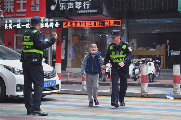 “同學(xué)們,請(qǐng)排隊(duì)有序通過,不要相互推擠?!痹谄翁锸袑?shí)驗(yàn)小學(xué)門口,身穿紅馬甲的家長(zhǎng)志愿者,戴紅袖標(biāo)的學(xué)校工作人員,警容嚴(yán)整的執(zhí)勤民警各司其職,他們?cè)谛iT口積極開展交通引導(dǎo)、護(hù)送學(xué)生安全通過斑馬線、勸導(dǎo)違停車輛忙碌的身影,總是讓家長(zhǎng)和孩子們倍感溫暖和安心。