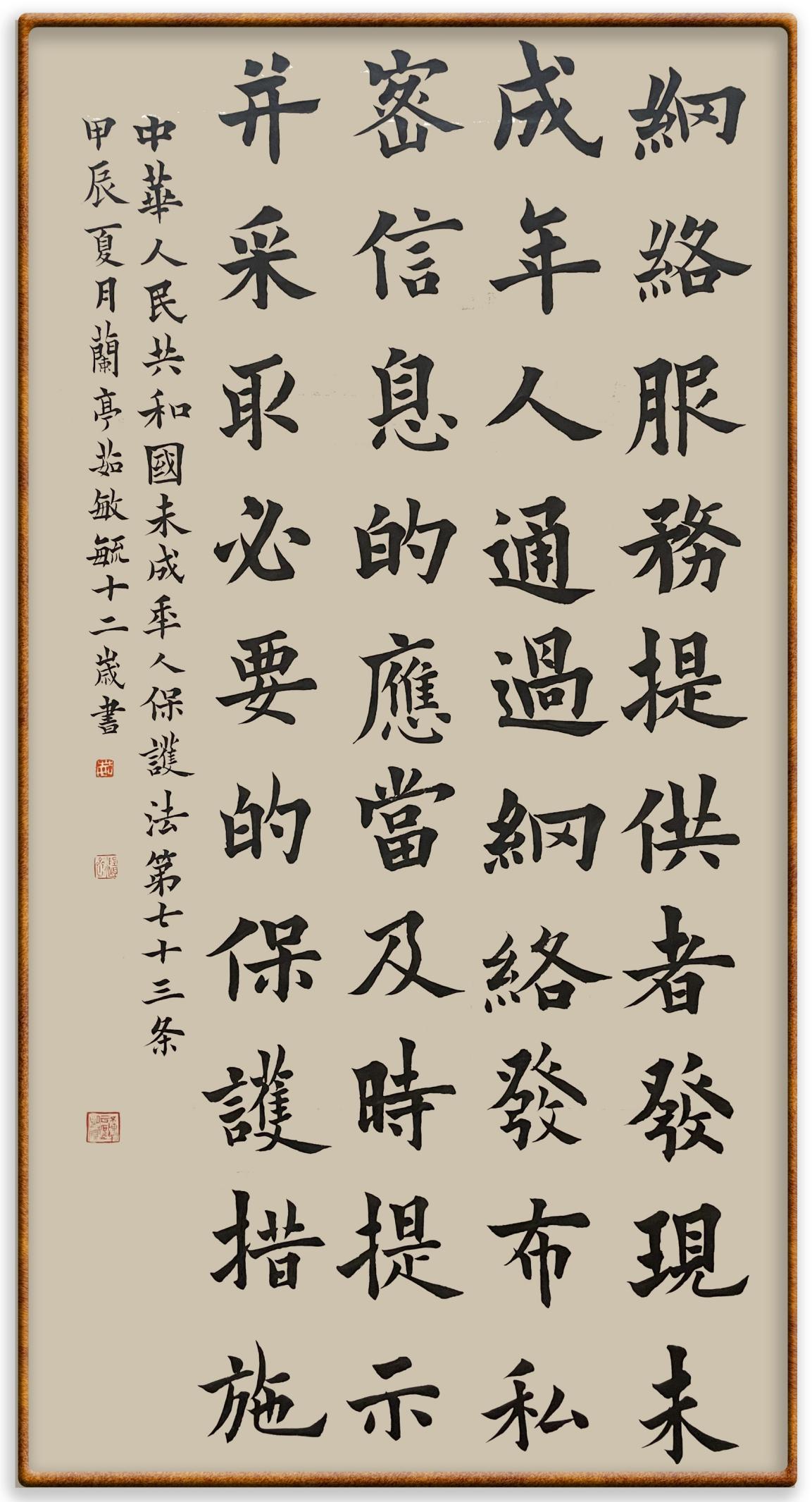 “六一”國際兒童節(jié)來臨之際,法制日報社聯(lián)合(全國)教育書畫協(xié)會基礎(chǔ)書法教育分會,推出“‘書·法’系列活動之書寫《中華人民共和國未成年人保護法》活動”,邀請小朋友書寫部分法條,讓孩子們在濃濃的節(jié)日氛圍中感受傳統(tǒng)文化的獨特魅力。