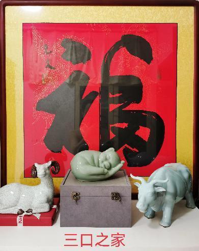 毫無(wú)疑問(wèn),正是這件作品隱含的濃烈親情元素和快樂(lè)因子,深深吸引并打動(dòng)了我,才最終成全了這筆交易,甚至讓我一不做二不休,干脆還買下了自己和夫人的生肖作品——羊和牛。返京后,我們將這三件清一色吃素的屬相工藝品,和家中原有的一幅大紅“福”字?jǐn)[在一起,便組合出一幅別有情趣的“和諧家園風(fēng)景圖”:幸福一家人、快樂(lè)一家親。