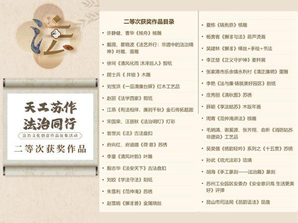 作品征集過程中,蘇州一大批非遺文化傳承人、手工藝人、法治文化愛好者等圍繞法治主題,創(chuàng)作出了形式多樣的法治文化創(chuàng)意作品,蘇繡、核雕、剪紙、緙絲、木雕等集思想性、藝術性、教育性于一體的高品質法治文化創(chuàng)意作品競相涌現。
