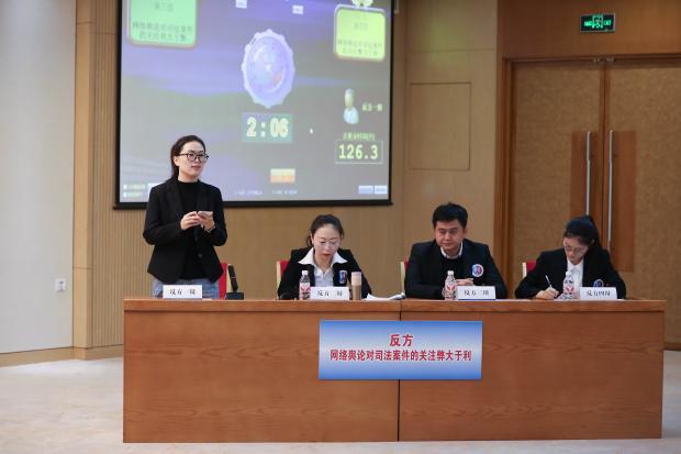 自由辯論環(huán)節(jié),正方明確主張:“法官在審理案件時,應基于內(nèi)心的良知、對全案事實整體的把握以及對相關(guān)法律的深入分析作出判決。網(wǎng)絡(luò)輿論對司法案件的關(guān)注,有助于陽光司法”。