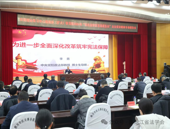 11月29日,黑龍江省鶴崗市委理論學(xué)習(xí)中心組集體(擴(kuò)大)學(xué)習(xí)暨2024年“百名法學(xué)家百場(chǎng)報(bào)告會(huì)”法治宣講專場(chǎng)報(bào)告會(huì)在鶴崗舉行,邀請(qǐng)中央黨校政法部教授、博士生導(dǎo)師李勇作專題講座。鶴崗市委書(shū)記王興柱及市委理論學(xué)習(xí)中心組成員,市級(jí)班子秘書(shū)長(zhǎng)、市直各單位主要領(lǐng)導(dǎo)、各縣區(qū)領(lǐng)導(dǎo)、政法各單位科以上干部及法學(xué)會(huì)全體會(huì)員參加。兩縣六區(qū)、市公安局、市教育培訓(xùn)基地設(shè)立分會(huì)場(chǎng),共1100余人參會(huì)。市委副書(shū)記、市委政法委書(shū)記馬春波主持。