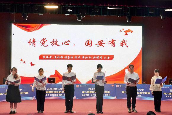 西北政法大學(xué)第八屆國(guó)家安全知識(shí)競(jìng)賽于今年3月正式拉開帷幕。4月10日,本屆知識(shí)競(jìng)賽決賽在長(zhǎng)安校區(qū)滿天星學(xué)術(shù)報(bào)告廳圓滿舉行。素養(yǎng)展示環(huán)節(jié),法治宣講團(tuán)成員以“請(qǐng)黨放心,強(qiáng)國(guó)有我”為題進(jìn)行宣講展示。