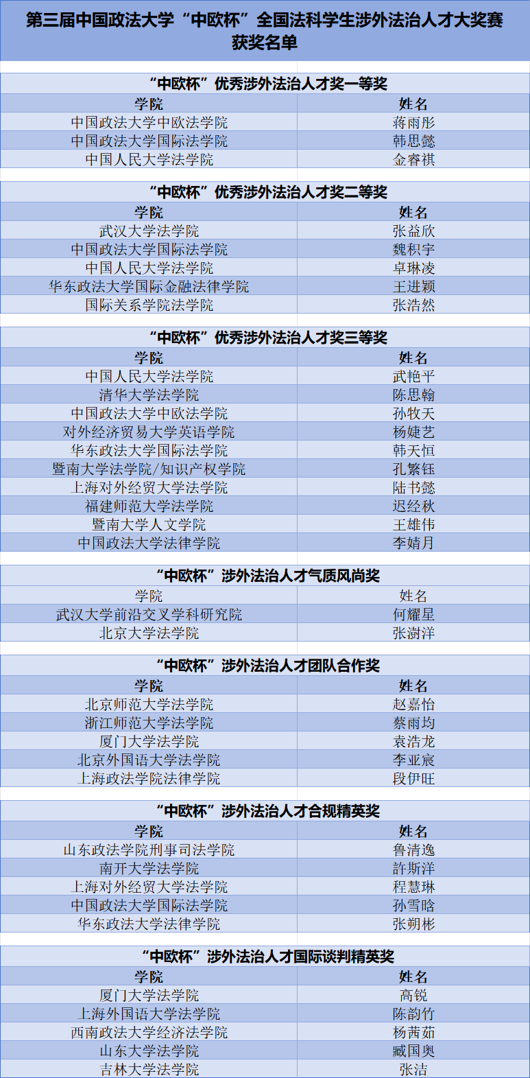 經過激烈角逐,最終來自全國28所法學院系的35名同學脫穎而出。復賽共評選出:“中歐杯”優(yōu)秀涉外法治人才一等獎3名、二等獎5名、三等獎10名,“涉外法治人才氣質風尚獎”2名,“涉外法治人才團隊合作獎”5名,“涉外法治人才合規(guī)精英獎”5名,“涉外法治人才國際談判精英獎”5名。