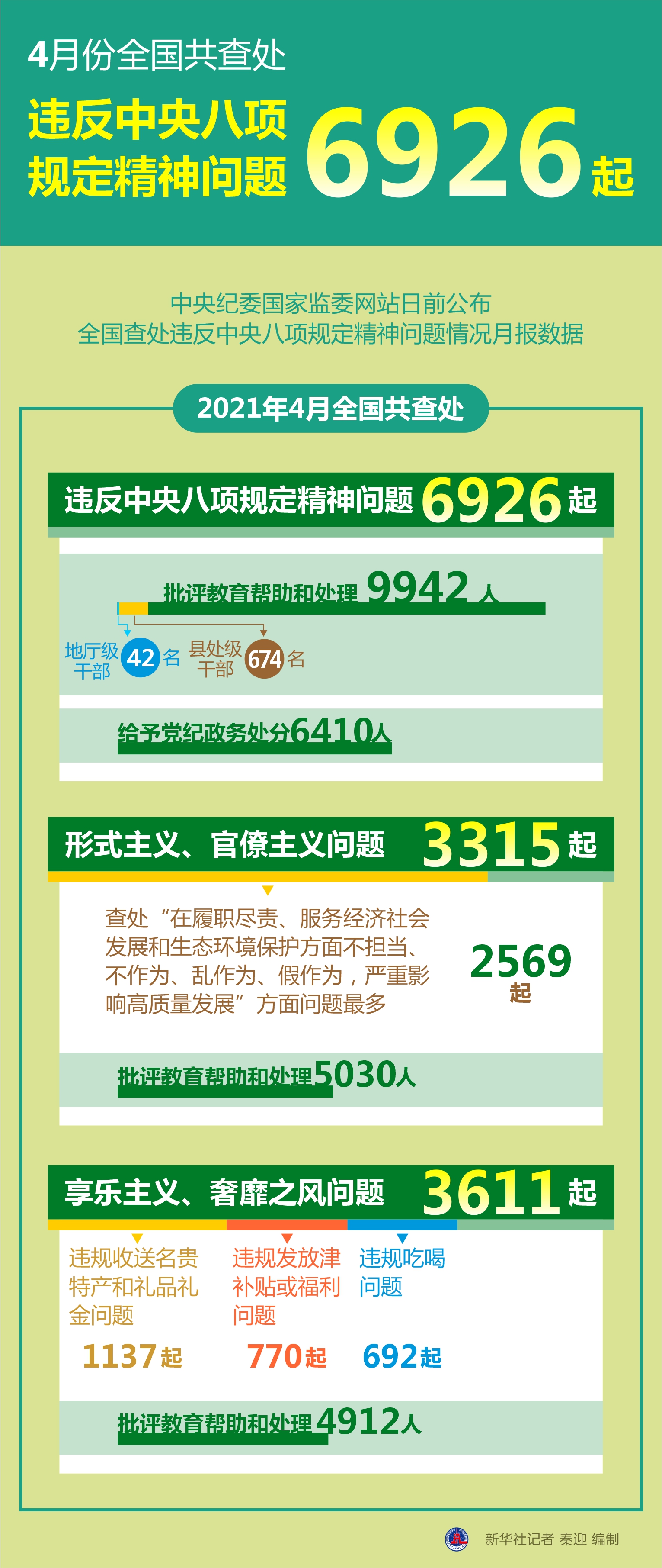 圖表:4月份全國共查處違反中央八項(xiàng)規(guī)定精神問題6926起