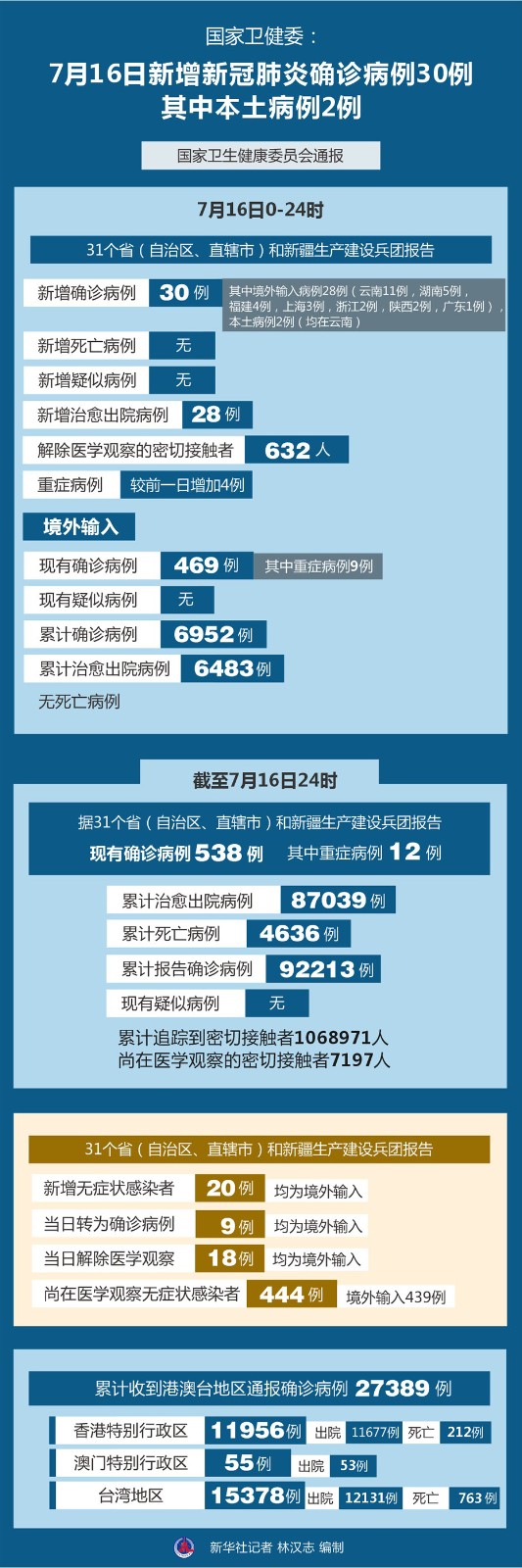 圖表:國(guó)家衛(wèi)健委:7月16日新增新冠肺炎確診病例30例 其中本土病例2例
