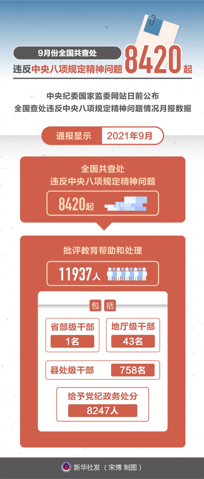 中央紀(jì)委國家監(jiān)委網(wǎng)站日前公布全國查處違反中央八項規(guī)定精神問題情況月報數(shù)據(jù)。通報顯示,2021年9月,全國共查處違反中央八項規(guī)定精神問題8420起,批評教育幫助和處理11937人(包括1名省部級干部、43名地廳級干部、758名縣處級干部),給予黨紀(jì)政務(wù)處分8247人。