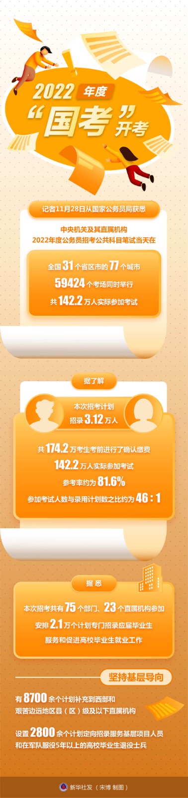 記者11月28日從國家公務(wù)員局獲悉,中央機(jī)關(guān)及其直屬機(jī)構(gòu)2022年度公務(wù)員招考公共科目筆試當(dāng)天在全國31個(gè)省區(qū)市的77個(gè)城市、59424個(gè)考場(chǎng)同時(shí)舉行,共142.2萬人實(shí)際參加考試。