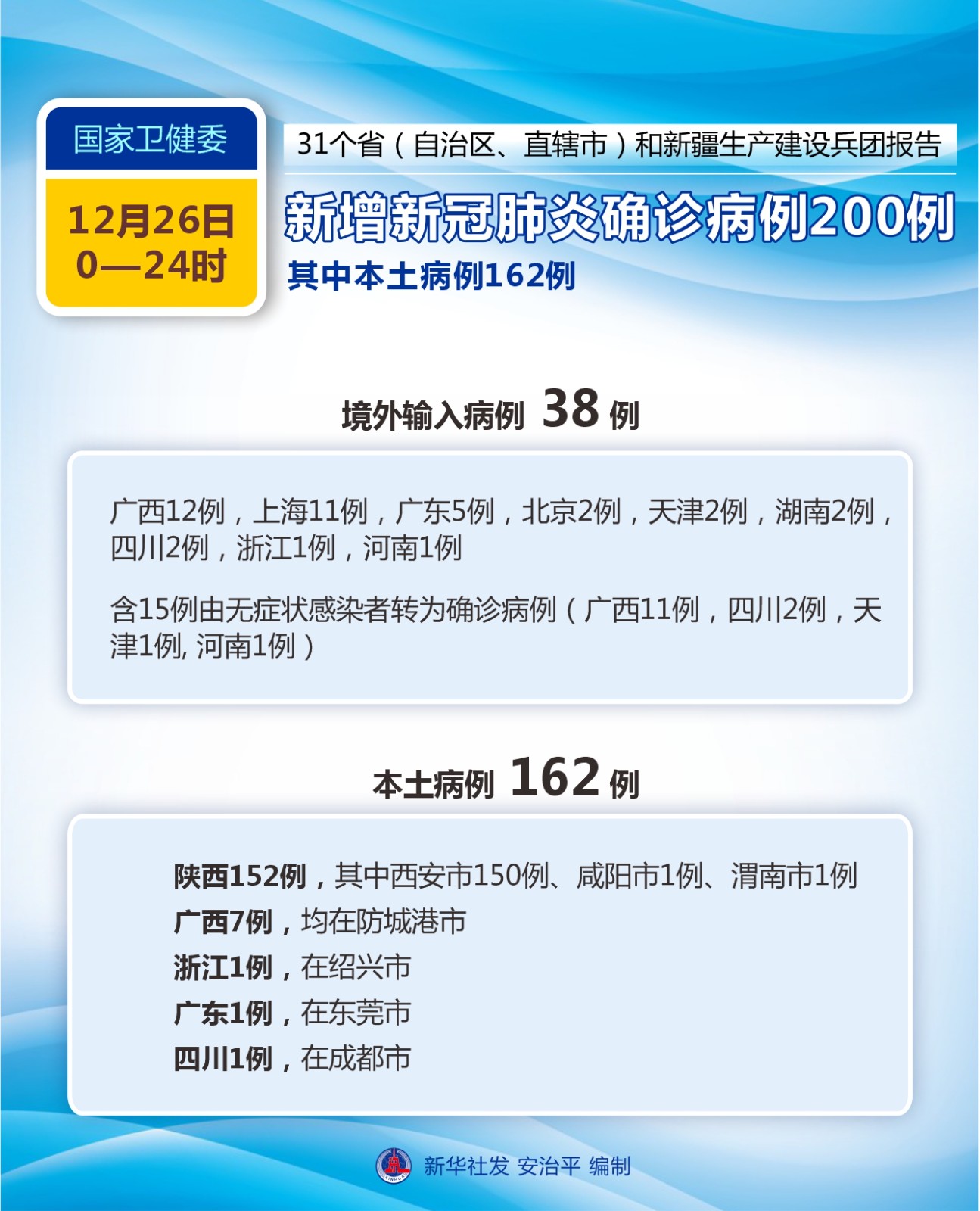 圖表:國家衛(wèi)健委:12月26日新增新冠肺炎確診病例200例 其中本土病例162例