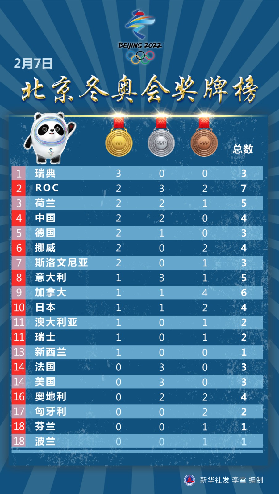 圖表:2月7日北京冬奧會(huì)獎(jiǎng)牌榜