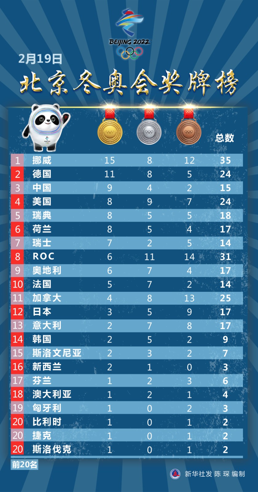 圖表:2月19日北京冬奧會(huì)獎(jiǎng)牌榜