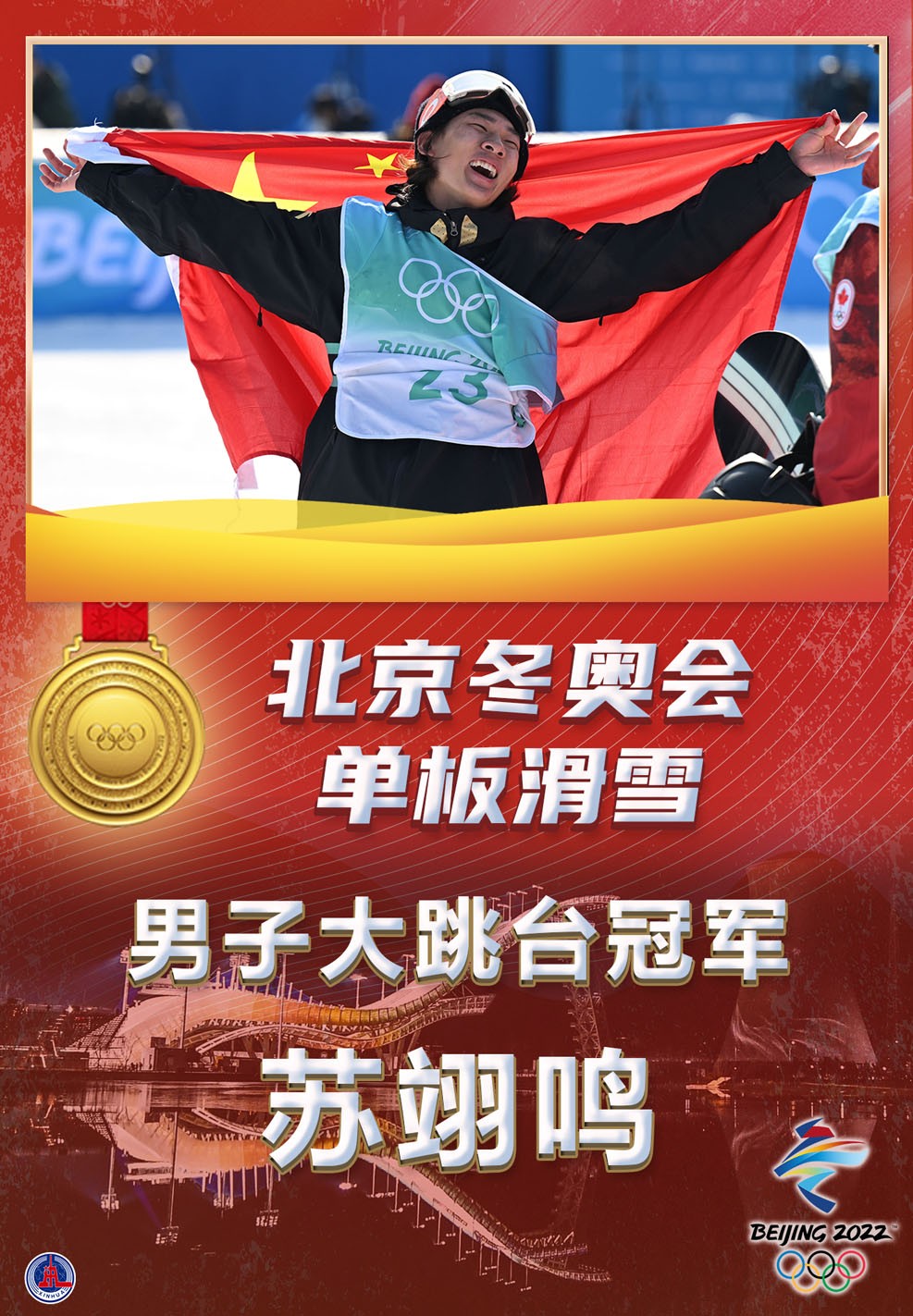2月15日,北京2022年冬奧會(huì)單板滑雪男子大跳臺決賽在北京首鋼滑雪大跳臺舉行。中國選手蘇翊鳴奪得金牌。