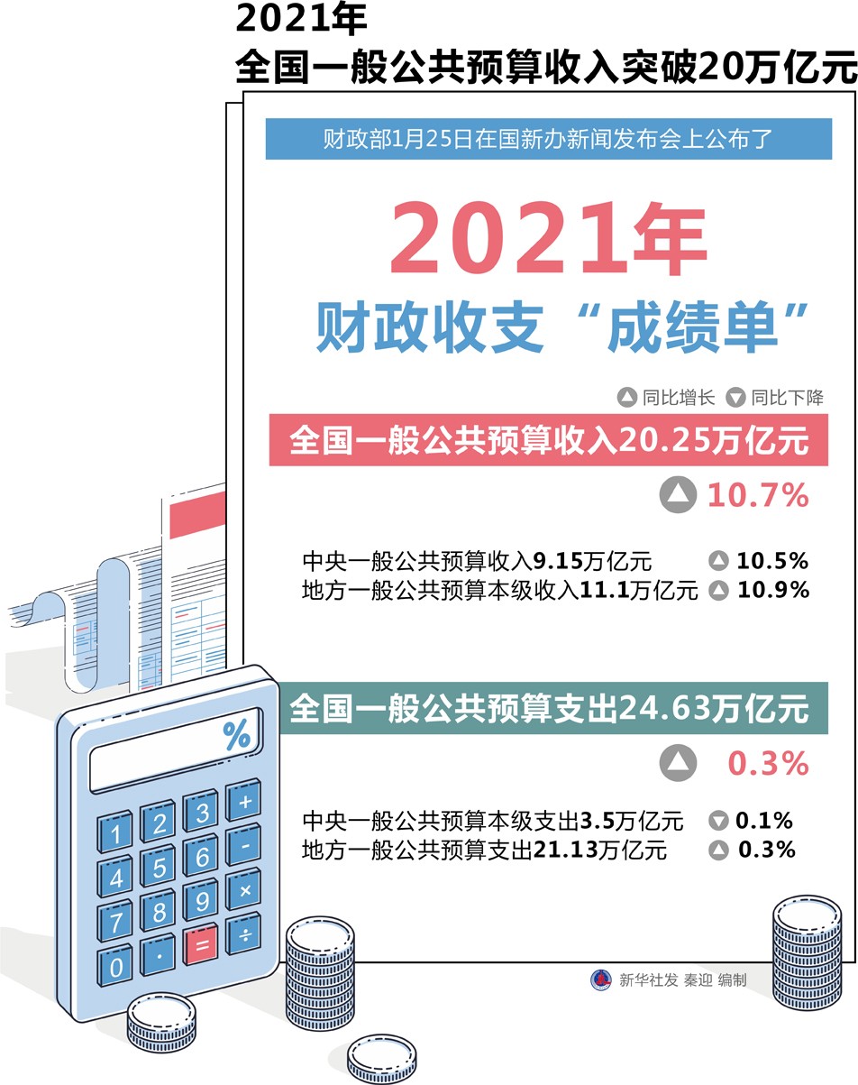 財政部1月25日在國新辦新聞發(fā)布會上公布了2021年財政收支“成績單”。數(shù)據(jù)顯示,2021年,全國一般公共預(yù)算收入20.25萬億元,同比增長10.7%;全國一般公共預(yù)算支出24.63萬億元,同比增長0.3%。