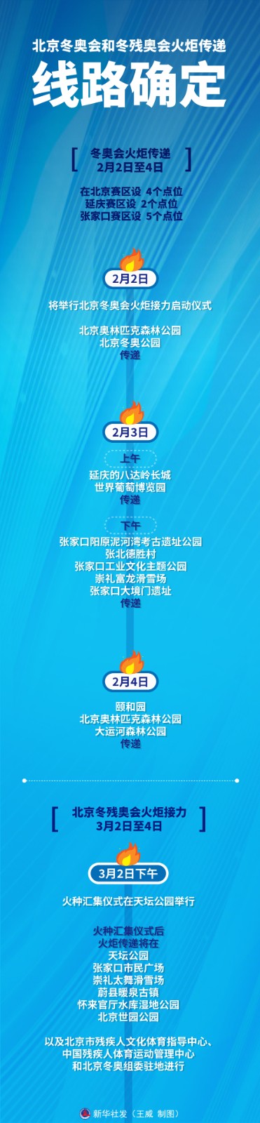 記者1月21日從北京2022年冬奧會和冬殘奧會組織委員會了解到,北京冬奧會火炬?zhèn)鬟f將于2月2日至4日在北京、延慶、張家口三個賽區(qū)進行。北京冬殘奧會火炬接力將于3月2日至4日進行。