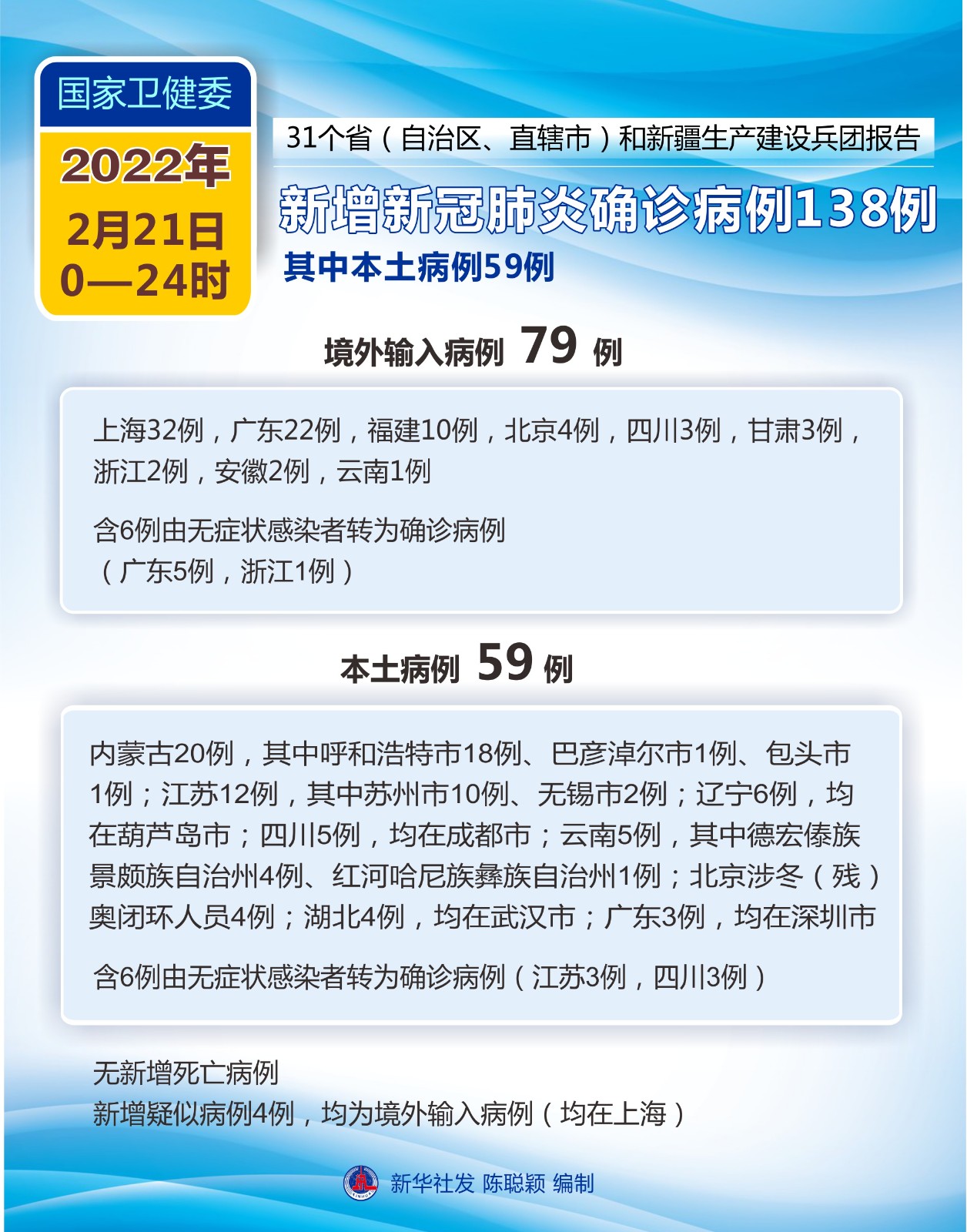 圖表:國家衛(wèi)健委:2月21日新增新冠肺炎確診病例138例 其中本土病例59例