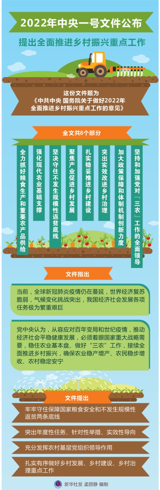 這份文件題為《中共中央 國(guó)務(wù)院關(guān)于做好2022年全面推進(jìn)鄉(xiāng)村振興重點(diǎn)工作的意見(jiàn)》,全文共8個(gè)部分,包括:全力抓好糧食生產(chǎn)和重要農(nóng)產(chǎn)品供給、強(qiáng)化現(xiàn)代農(nóng)業(yè)基礎(chǔ)支撐、堅(jiān)決守住不發(fā)生規(guī)模性返貧底線、聚焦產(chǎn)業(yè)促進(jìn)鄉(xiāng)村發(fā)展、扎實(shí)穩(wěn)妥推進(jìn)鄉(xiāng)村建設(shè)、突出實(shí)效改進(jìn)鄉(xiāng)村治理、加大政策保障和體制機(jī)制創(chuàng)新力度、堅(jiān)持和加強(qiáng)黨對(duì)“三農(nóng)”工作的全面領(lǐng)導(dǎo)。