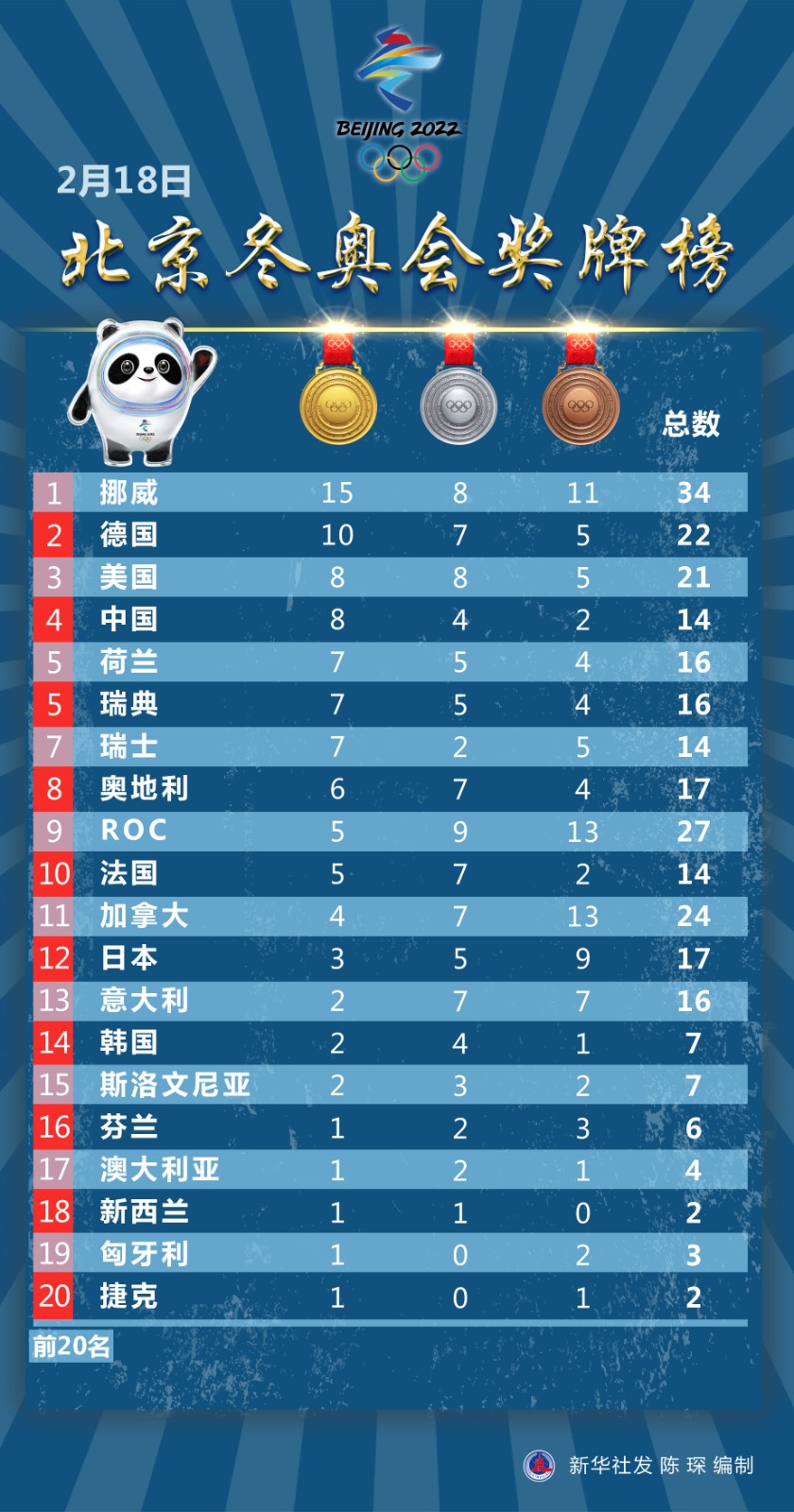圖表:2月18日北京冬奧會獎(jiǎng)牌榜