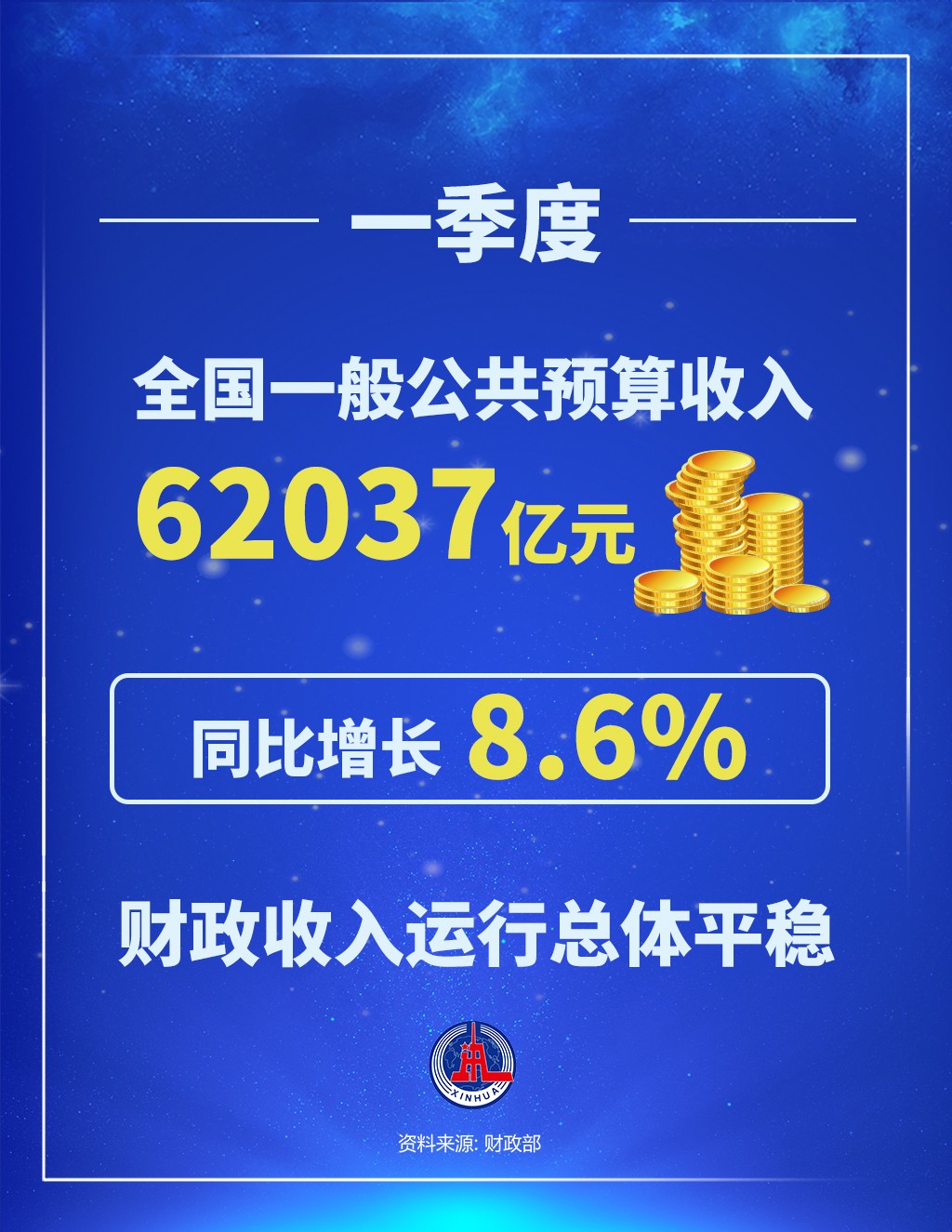 財政部4月20日發(fā)布數(shù)據(jù)顯示,一季度,全國一般公共預算收入62037億元,同比增長8.6%,財政收入運行總體平穩(wěn)。
