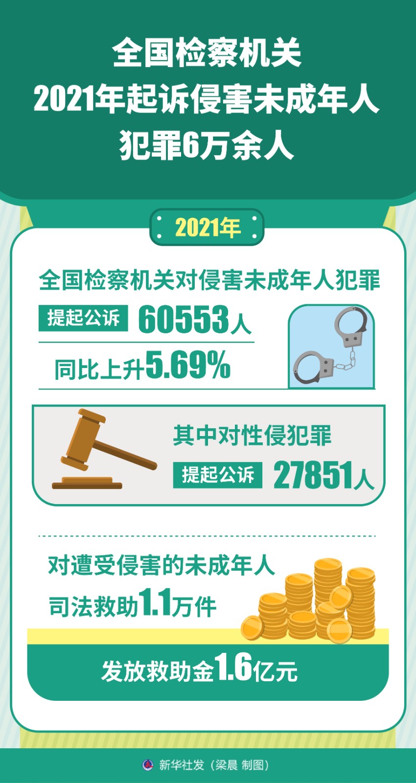 2021年,全國檢察機(jī)關(guān)對侵害未成年人犯罪提起公訴60553人,同比上升5.69%,其中對性侵犯罪提起公訴27851人。