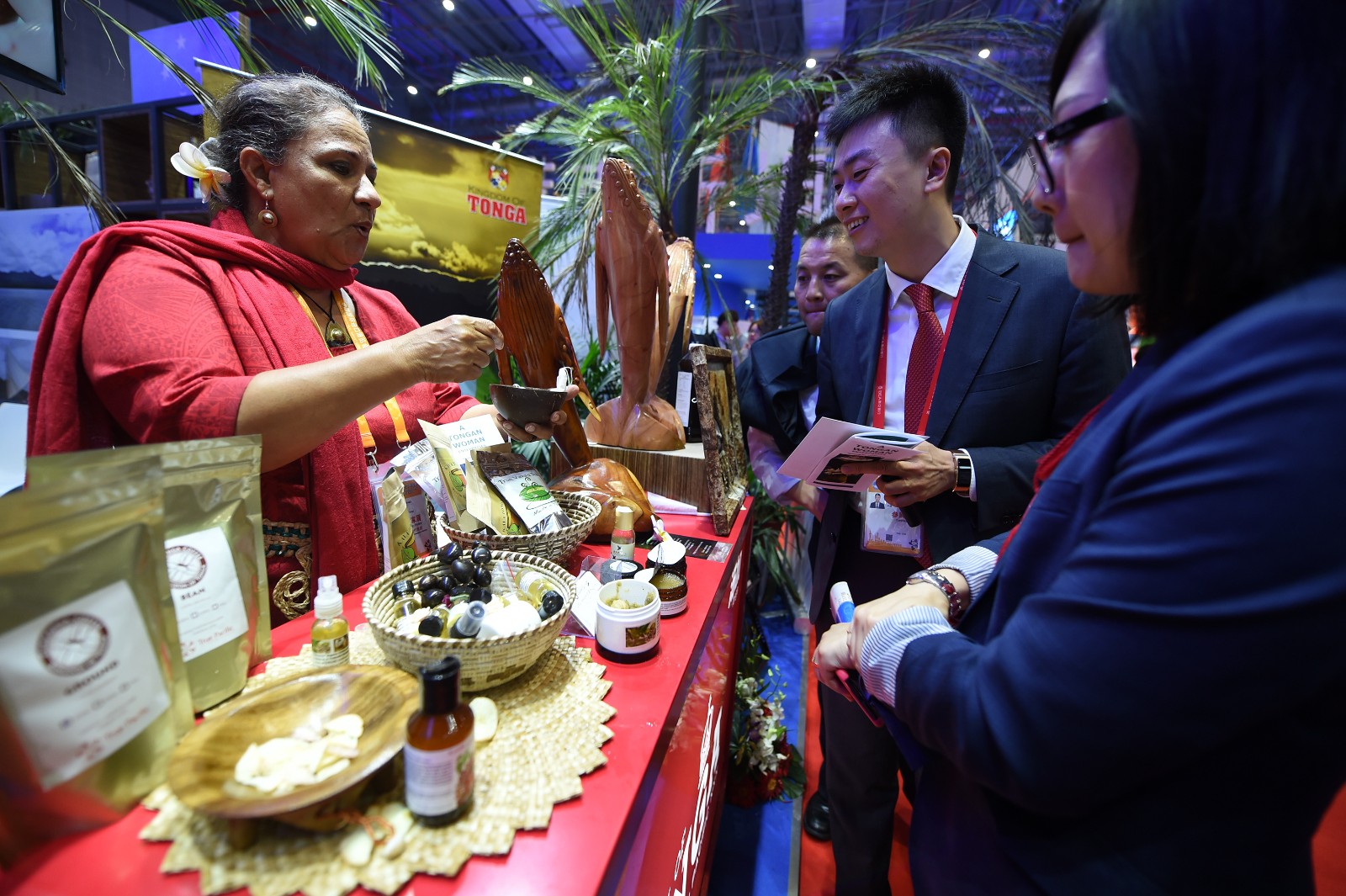 2018年11月6日,在首屆中國(guó)國(guó)際進(jìn)口博覽會(huì)上,太平洋島國(guó)展區(qū)湯加展臺(tái)的工作人員(左)向參觀者介紹展出的食品。