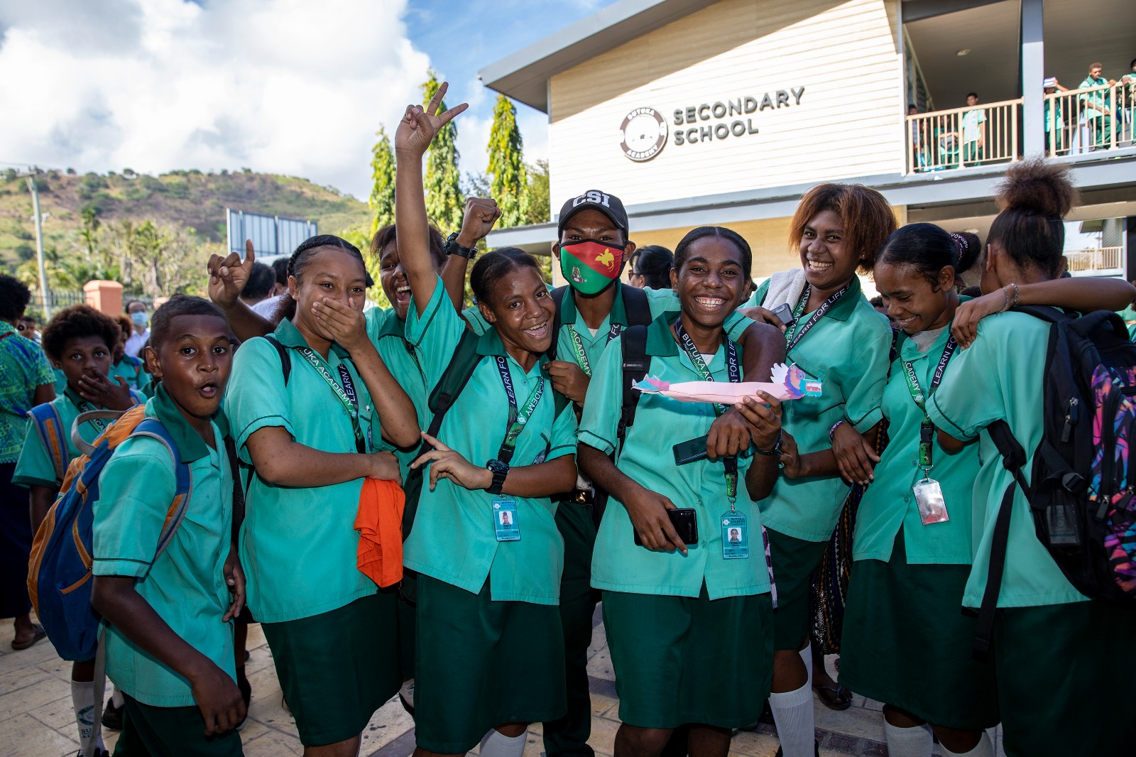 6月3日,在巴布亞新幾內(nèi)亞首都莫爾茲比港的布圖卡學(xué)園,學(xué)生們展示紙質(zhì)龍舟模型。