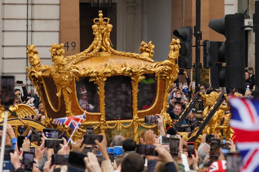 6月5日,人們?cè)谟?guó)倫敦觀看花車游行。