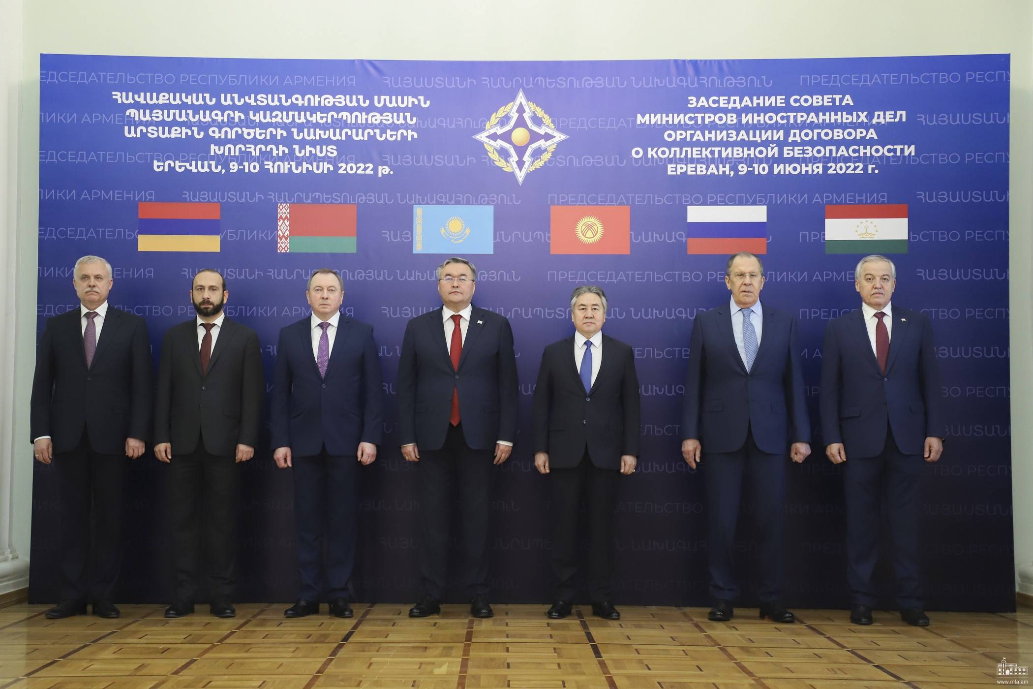 6月10日,集體安全條約組織(集安組織)秘書長扎斯(左一)和與會外長在亞美尼亞埃里溫合影。