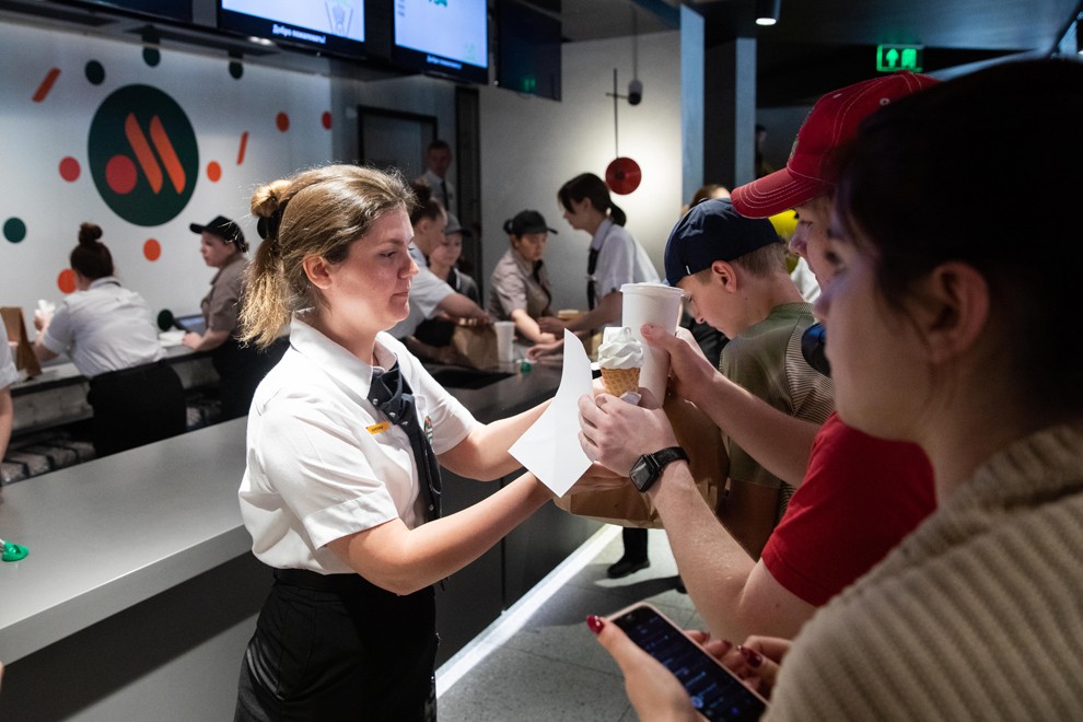 6月12日,在俄羅斯首都莫斯科普希金廣場(chǎng)的“只有美味”連鎖餐廳,工作人員將餐品遞給顧客。