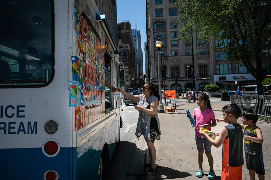 6月14日,在美國芝加哥,一名女子給孩子買冷飲。