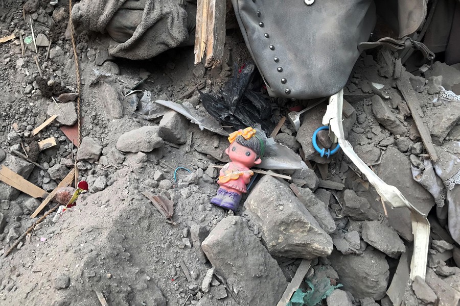 這是6月17日在埃及首都開羅樓房倒塌現(xiàn)場拍攝的廢墟中的玩偶。