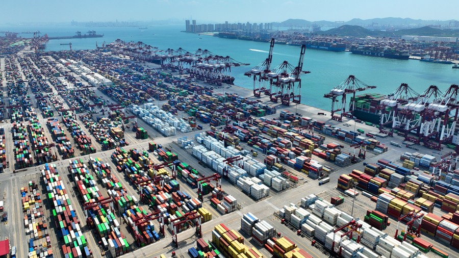 繁忙的山東港口青島港前灣港區(qū),集裝箱貨輪在裝卸集裝箱(6月15日攝,無(wú)人機(jī)照片)。
