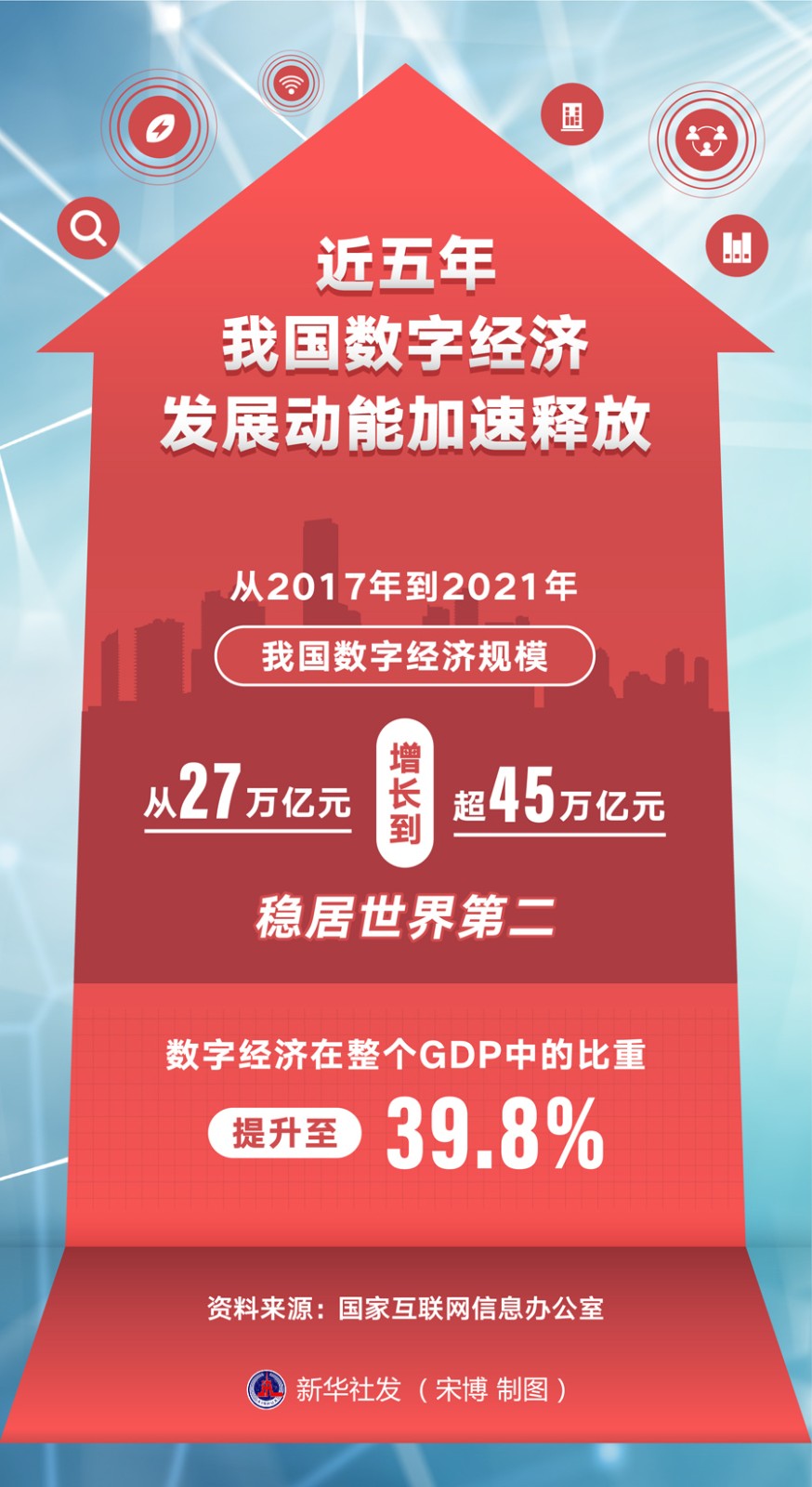 “從2017年到2021年,我國數(shù)字經(jīng)濟規(guī)模從27萬億元增長到超45萬億元,穩(wěn)居世界第二。數(shù)字經(jīng)濟在整個GDP中的比重提升至39.8%?!眹一ヂ?lián)網(wǎng)信息辦公室副主任曹淑敏7月5日在第五屆數(shù)字中國建設(shè)峰會新聞發(fā)布會上表示,黨的十九大以來,數(shù)字經(jīng)濟發(fā)展動能加速釋放。