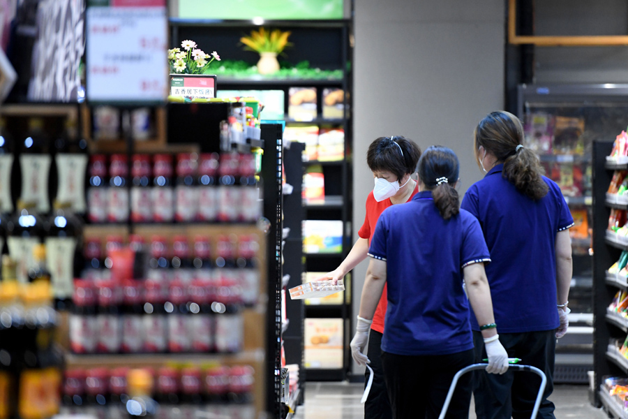 7月4日,泗縣佳美超市的工作人員根據(jù)線上訂單分揀商品。